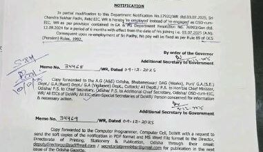 ଜଳସମ୍ପଦ ବିଭାଗ ସର୍ବୋଚ୍ଚ ଯନ୍ତ୍ରୀ ଚନ୍ଦ୍ରଶେଖର ପାଢ଼ୀଙ୍କୁ ପୁନଃ ଦାୟିତ୍ୱ